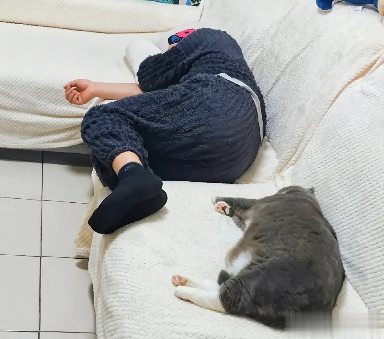 说特殊习惯,有只猫小时候食道有问题,只能趴着吃饭,主人陪着它也趴下,猫就贴着主人,一起趴着,吃完眼神特别满足,像有种默契,主人一趴,猫就更安心,身体贴着,尾巴绕着胳膊。
